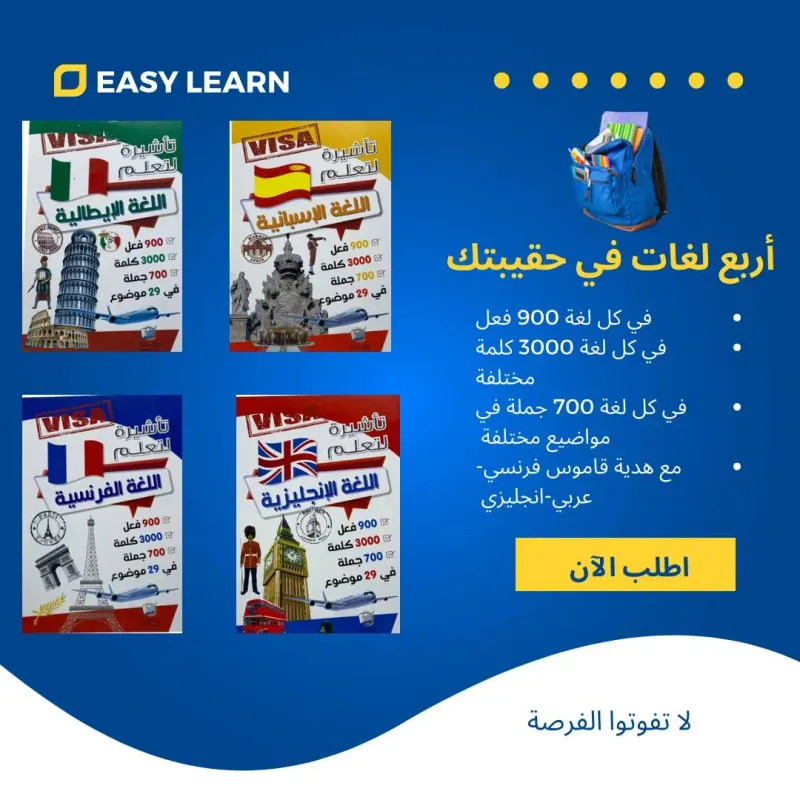 هل تحلم بتعلم لغات جديدة واستكشاف ثقافات متنوعة؟ نقدم لك باقة “اربع لغات في حقيبتك“، حل مميز لتحقيق أهدافك اللغوية! تحتوي هذه الباقة على كتب تعليمية لكل من الفرنسية، الإنجليزية، الإسبانية، والإيطالية، تضم 900 فعل، 3000 كلمة، و700 جملة تغطي 29 موضوعًا مختلفًا. كهدية إضافية، ستحصل على قاموس فرنسي-عربي-إنجليزي لمساعدتك في الترجمة وتوسيع مفرداتك. لا تفوت هذه الفرصة. اطلب نسختك الآن وابدأ مغامرتك اللغوية!
